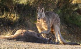 Canguro llora a su compañera y su cría luego de que un auto los atropelló