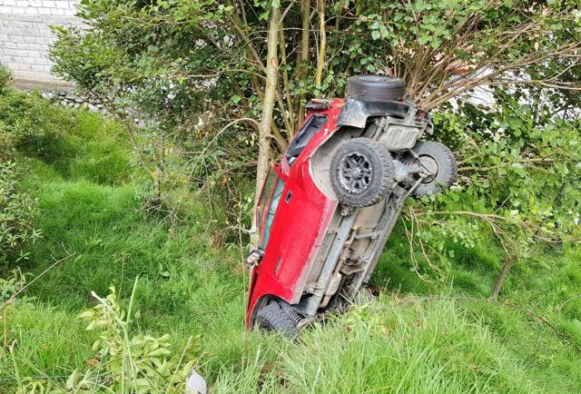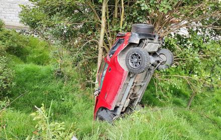 Quedó atascado en un árbol luego de rodar unos 60 metros de la vía principal. Es un Chevrolet Vitara de tres puertas de color rojo que fue hallado suspendido en el árbol, pero no se hallaron a sus ocupantes.