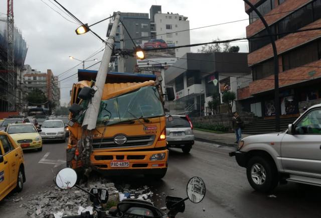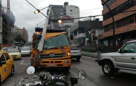 Una volqueta que circulaba desde el norte hacia el sur de la ciudad se fue contra un poste de alumbrado eléctrico. El golpe fue tan fuerte que el parante se desprendió en su totalidad.