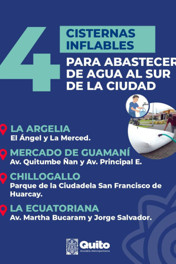 La emergencia por el desabastecimiento de agua potable continúa afectando a unas 400.000 personas del sur del Distrito Metropolitano de Quito. Como parte de las acciones emergentes, la Alcaldía capitalina y la Empresa Pública Metropolitana de Agua Potable y Saneamiento (EPMAPS) desplegaron más estrategias, además de la distribución de agua en tanqueros.