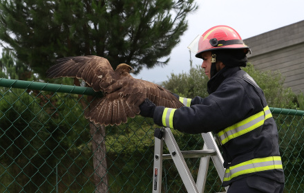 El Cuerpo de Bomberos de Quito acudió rápidamente con una unidad de rescate animal. Al llegar, encontraron al águila agitada y asustada, sin poder liberarse por sí misma. Con el uso de una escalera y herramientas especializadas, los rescatistas lograron sujetarla con cuidado y cortar parte de la malla para evitar que se lastime.