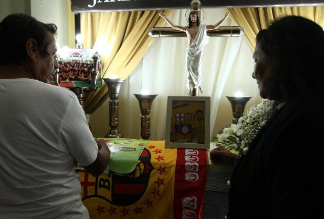 La bandera con la que siempre alentaba al equipo de sus amores -Barcelona- y una fotografía de él, cubren el ataúd.