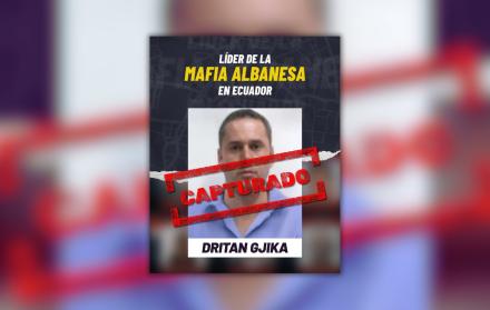 El Ministerio del Interior de Ecuador confirmó este lunes 26 de mayo de 2025 la captura de Dritan Gjika, presunto líder de la mafia albanesa en el país, en una operación conjunta con la Interpol y autoridades de Emiratos Árabes Unidos y España. Gjika, de nacionalidad albanesa y 47 años de edad, fue detenido en Abu Dabi, desde donde se iniciará el proceso legal para su extradición hacia Ecuador.