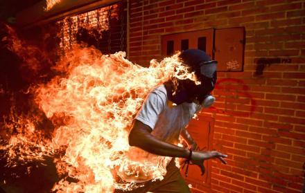 Tomada en 2017, la foto muestra a un joven en llamas durante una de las numerosas protestas que se dieron en Caracas, Venezuela.