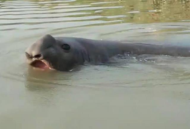 El mamífero, de casi tres metros, de largo fue visto en un estero del río Colorado y como la corriente en esa zona es baja, se quedó embancado por unas horas sin poder continuar su recorrido. Los habitantes empezaron a filmarlo y en un video se ve al elefante marino enredado en las redes de pesca mientras con una caña lo amenazan para que no intente cruzarlas.