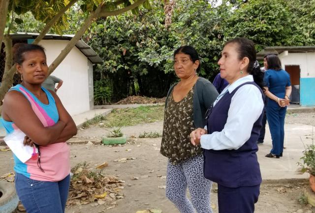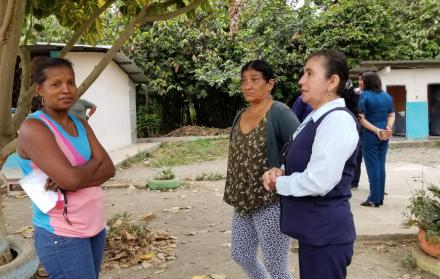 Juana Aguayo y Julia Sánchez recorren las instalaciones de la Unidad Educativa Santo Domingo para supervisar que personas ajenas al recinto no se acerquen al plantel educativo en el que estudian sus hijos.