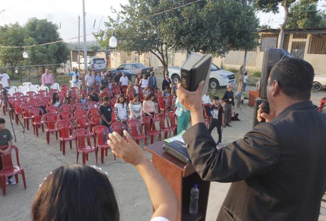 Jiménez y su esposa suben a la tarima e inician el evento. Durante la oración, recuerdan que están respaldados por el Señor y que es Él quien les da la fortaleza. A pesar de estar en una zona tomada por bandas delictivas, los asistentes muestran tranquilidad. “Todo esto es obra de Dios, no hay más explicación”, dice uno de ellos.