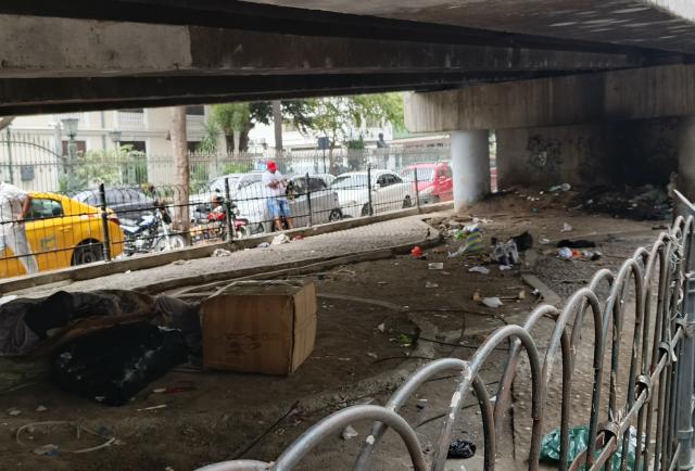 "Siempre ha sido así. El olor es insoportable. La gente hace sus necesidades aquí. Uno se acostumbra, pero no es normal", comenta, mientras señala una abertura bajo el puente que conecta con lo que parece una caseta improvisada. Allí duermen personas, asegura.