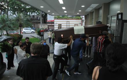En una de las salas de velación que están frente al Cementerio Patrimonial de Guayaquil, los restos mortales de Marco Enrique Castañeda Mendoza reciben el último adiós de sus seres queridos. El domingo, el hombre perdió la vida a tiros propinados por delincuentes que ingresaron a robar al bus interprovincial donde él viajaba de Quito al Puerto Principal.