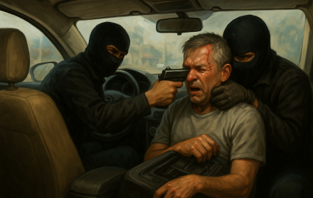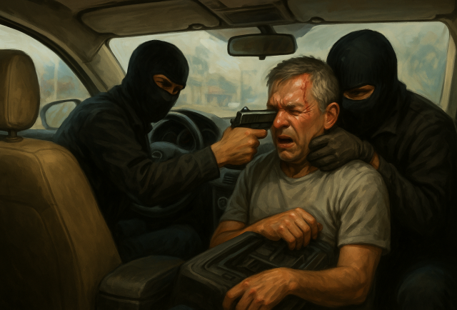 Al llegar al destino, uno de los pasajeros lo sujetó desde atrás y el otro le apuntó con una pistola en la frente. Lo obligaron a pasar al asiento trasero y lo retuvieron en el piso del vehículo, mientras organizaban el robo del auto.