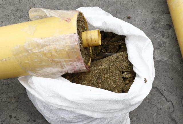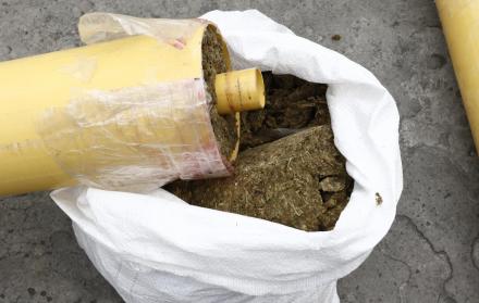 “No solo encontramos los tubos de tela donde estaba camuflada la droga sino cinco cartones en los cuales se encontró 80 paquetes de bloques con cinta de embalaje café y se identificó que también era marihuana”, refirió el coronel.