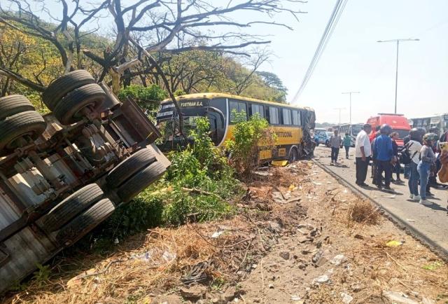 Mientras se realizaban los arreglos en la unidad de transporte, un tráiler que circulaba por la Perimetral inesperadamente se impactó contra el expreso, cayendo luego hacia una cuneta y ocasionando daños. El hombre que conducía el camión no fue hallado en el sitio.