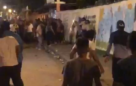 Un grupo de policías que custodiaban el recinto electoral Teodoro Alvarado Garaicoa, fueron agredidos por los manifestantes con piedras y palos para luego empezar a derribar la pared del establecimiento.