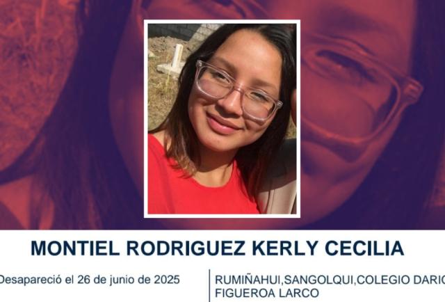 Kerly Cecilia Montiel Rodríguez, una adolescente de 17 años se encuentra desaparecida y su familia se encuentra desesperada por ubicarla. Ella fue vista por última vez el jueves 26 de junio del 2025 rumbo al colegio Dario Figueroa Larco, ubicado en Sangolquí, al oriente de Quito.