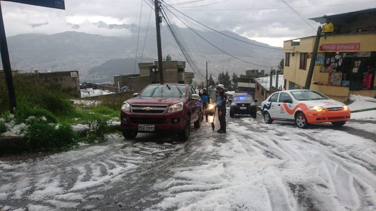 También en las calles Pompeya y Muisne, sector San Martín, se registra acumulación de agua y granizo en la vía. Existe un vehículo atrapado, aunque no hay afectación a personas.