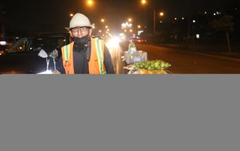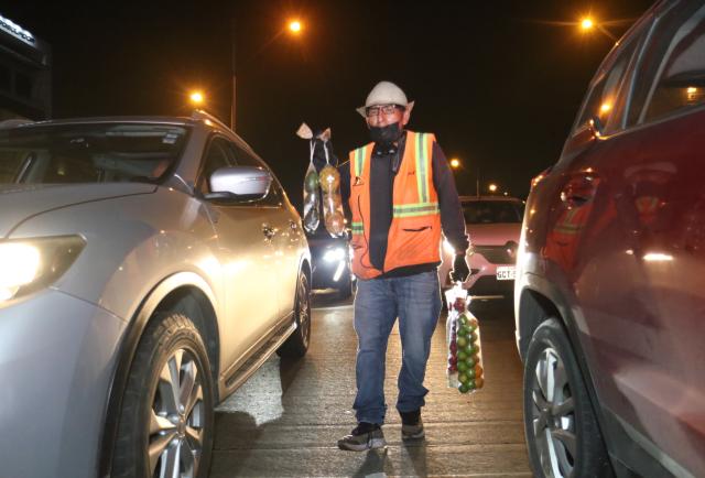 Pese a sus 70 años, las encandilantes luces de los vehículos no lo espantan. De hecho, lo atraen, porque sus fieles compradores bajan las ventanas de sus carros o agitan las manos para llamar su atención cuando el semáforo está en rojo.