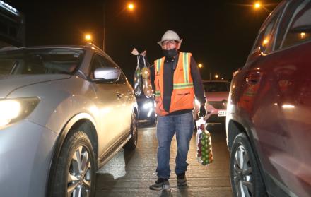 Cuando al empezar la noche muchos acaban su jornada laboral, esta recién comienza para Manuel Yumbo. Serpenteando entre los vehículos en la avenida del Bombero, en el tramo centro-vía a la costa, este adulto mayor, originario de Colta, localidad de la provincia de Chimborazo, ofrece frutas que cuelgan de sus manos protegidas con guantes.