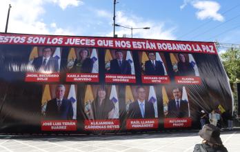 Uno de los más polémicos símbolos contra los jueces son algunas vallas publicitarios que muestran los rostros y nombres de los magistrados, tildándolos como quienes "se están robando la paz". Justamente el ECU 911 confirmó que una de estas estructuras cayó sobre dos ciudadanos que resultaron con heridas leves.