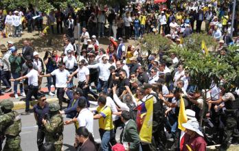 Luego de que el presidente Daniel Noboa se dirigiera a los manifestantes, algunos de ellos empezaron a lanzarse palabras, defendiendo su posición política. Hubo golpes y hasta se lanzaron agua.