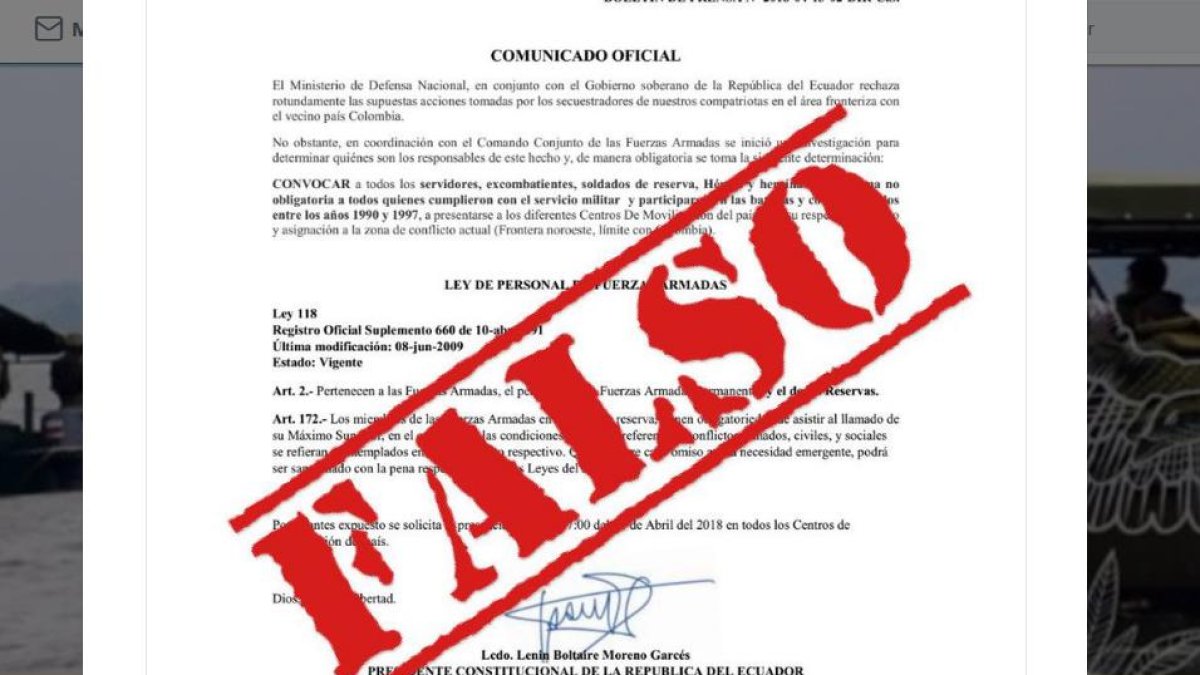 Lo que se ha difundido lleva la firma del Ministerio de Defensa, del presidente Lenín Moreno y del Comandate de las Fuerzas Armadas. En el comunicado hacen un llamado a excombatientes, soldados de reserva, héroes y heroínas a sumarse en la “zona de conflicto”, la frontera norte.