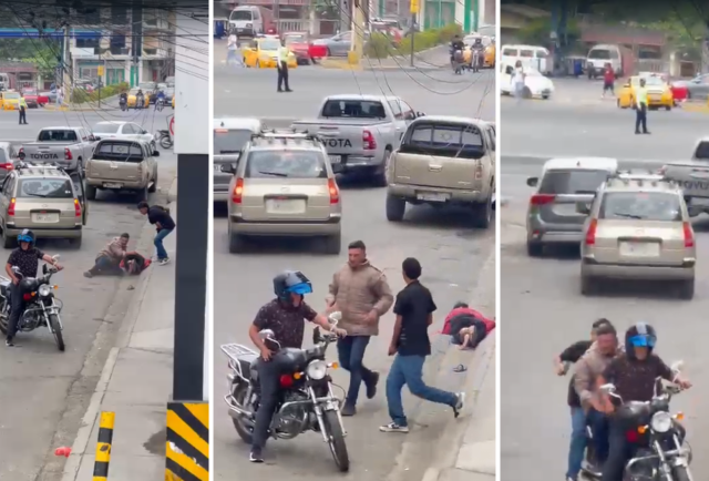 Segundos después, estos dos sujetos se levantaron y se sumaron al conductor de una motocicleta que los esperaba a menos de dos metros de donde presuntamente cometieron el robo. Sin embargo, en uno de ellos, un joven, llamaba la atención por tener un arma de fuego en una de sus manos.