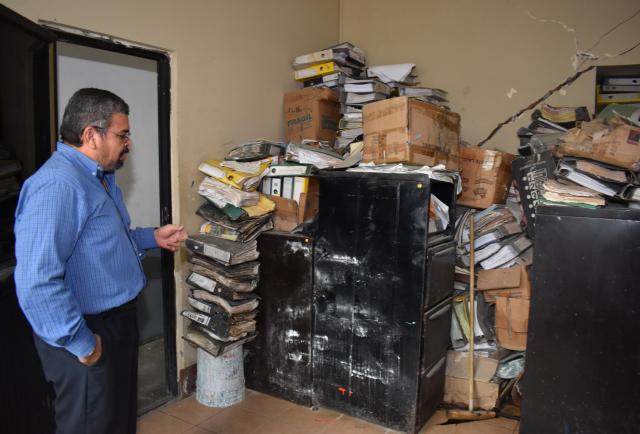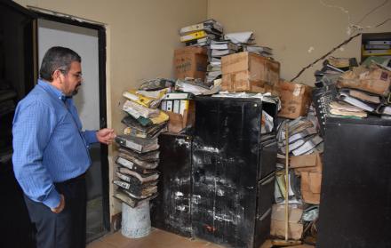 En compañía de la notaria del cantón, Leyla Burgos, ayer constató que las instalaciones del palacio municipal habrían sido usadas como bodegas. Se denunció que las computadoras estaban sin discos duros, los folder sin documentos, escritorios en mal estado, departamentos con filtraciones de agua y las repisas sin ningún tipo de información sobre las gestiones realizadas por el alcalde saliente.