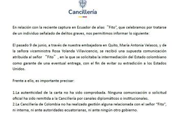 En el comunicado oficial, el Gobierno colombiano fue enfático: "La Cancillería no actúa como garante de narcotraficantes, ni tiene competencia alguna para mediar en este tipo de situaciones". Asimismo, dejó claro que no ha adelantado gestiones internas ni internacionales relacionadas con alias Fito.