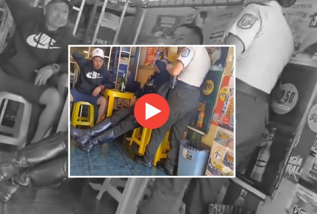 En el video que dura un minuto con 16 segundos se puede observar a dos policías con uniforme que están dentro de una tienda, en un espacio donde hay una mesa y sillas de plástico. Uno de los gendarmes es hombre y está sentado junto a un hombre.