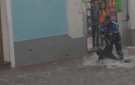 “En las calles Guayaquil y Manabí, producto de la lluvia, observo que una persona de la tercera edad es arrastrada por la lluvia... me dispuse a socorrer al señor y ponerlo a buen recaudo para que no sufra golpes que puedan afectar su salud”, cuenta el agente.