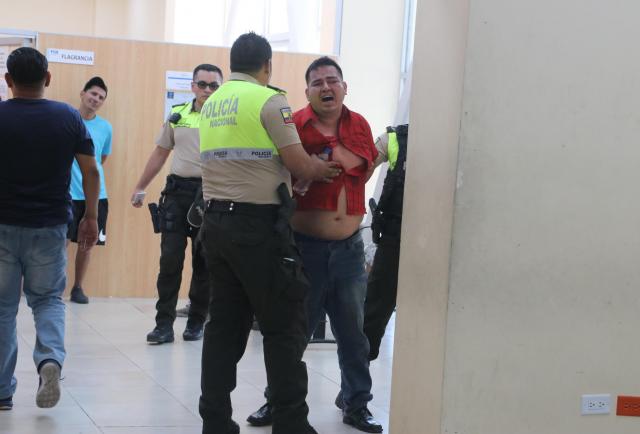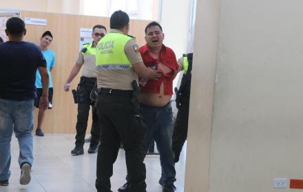 Su llegada llamó la atención de quienes estaban en el sitio, porque a cada paso gritaba que los uniformados lo habían agredido. “Este perro... me tiró gas en la cara”, decía mientras señalaba a uno de los gendarmes. Luego, fue presentado ante el fiscal de turno, Marco Gaibor, quien dispuso su detención.