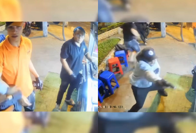 No obstante, a los pocos segundos, un sujeto de chompa blanca y gorra negra apareció en la escena portando un arma de fuego con la que primero intimidó al cocinero e intentó quitarle su teléfono; este, en primera instancia, se negó a darle el móvil y lo escondió detrás de su cuerpo.