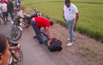 Agentes de la Policía Judicial de Daule, vestidos de civil, detuvieron a un sospechoso. El individuo estaba entre los curiosos y llevaba un arma de fuego. Los agentes buscaban determinar si tiene relación con este suceso u otro evento delictivo.