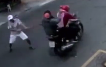 Inesperadamente, más adelante, un vecino golpeó con una escoba a los individuos mientras huían en la motocicleta, provocando que cayeran.