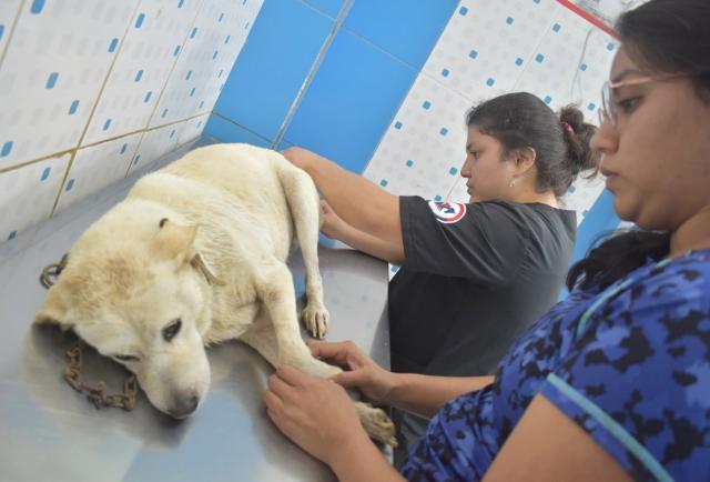 Durante la exploración de sus partes ensangrentadas, la perrita estuvo incómoda y mostraba temor, pero Nathaly la tranquilizaba para que le tomaran muestras para hacer exámenes de laboratorio.