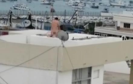Bajo la brisa marina, con una vista panorámica portuaria y completamente desnudos, una pareja dio rienda suelta a sus instintos pasionales y aparentemente mantuvo relaciones sexuales en la terraza de un edificio.