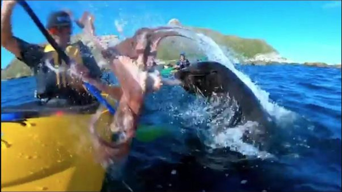 El neozelandés Kyle Mulinder practicaba piragüismo (competencia deportiva en kayaks) en aguas marinas de su país cuando una foca emergió cerca de su canoa y le lanzó a la cara un pulpo que llevaba en la boca, según imágenes que hoy divulgan los medios locales.