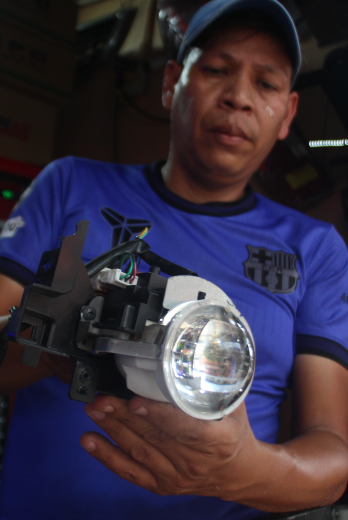 “Hay personas que montan luces amarillas por estética, pero este color es para manejar en la lluvia y en la niebla, como en la sierra, por ejemplo, ahí permite ver mejor, pero en la ciudad debe usarse luz blanca”, explicó Ronny Coello, administrador del taller de faros Zuko Car, en la calles Pedro Pablo Gómez, entre Andrés Marín y Babahoyo, al sur de Guayaquil.