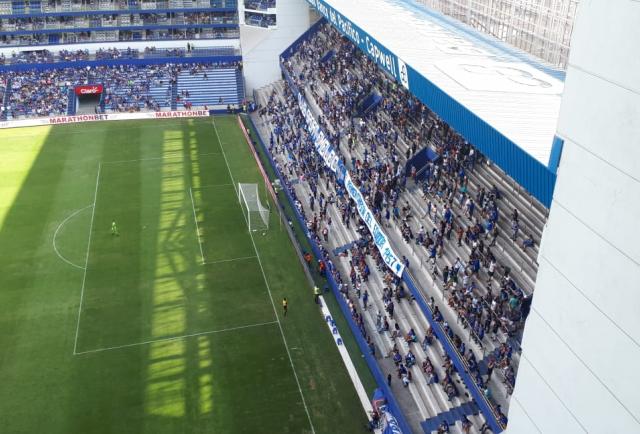 Gran parte de la localidad lució gris. Los hinchas que lograron entrar a la platea debieron improvisar los instrumentos y un balde lo transformaron en bombo. Por ratos, el puñado de hincha alba se imponían a los cánticos azules.