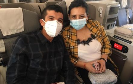 La Locomotora del Carchi arribó a Quito la noche del martes 10, junto a su esposa Tania Rosero. El avión en el que viajaron desde Madrid fue recibido con un arco de agua y la torre de control iluminada de amarillo, azul y rojo.