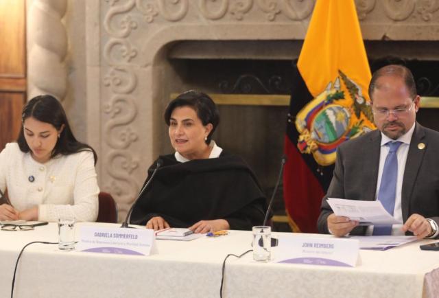 La reunión estuvo encabezada por la canciller Gabriela Sommerfeld, junto a la ministra de Economía y Finanzas, Sariha Moya, y el ministro del Interior, John Reimberg. Durante la cita, los funcionarios expusieron los fundamentos de la decisión económica, así como los mecanismos de redistribución de recursos orientados a apoyar a los sectores más vulnerables del país.