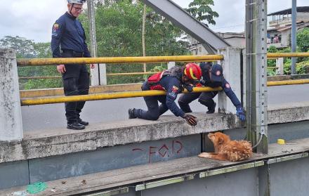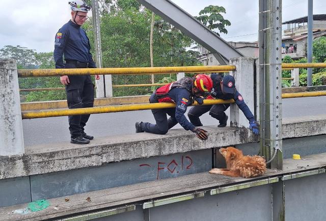 Un perro quedó atrapado al borde del puente sobre el río Blanco, en Quinindé, y fue rescatado por un equipo especializado del Cuerpo de Bomberos.