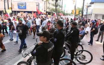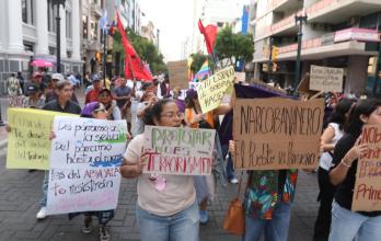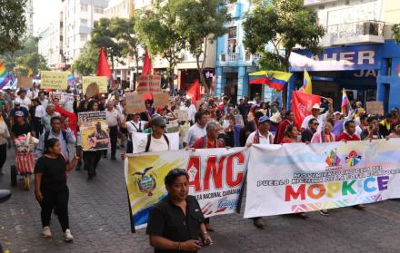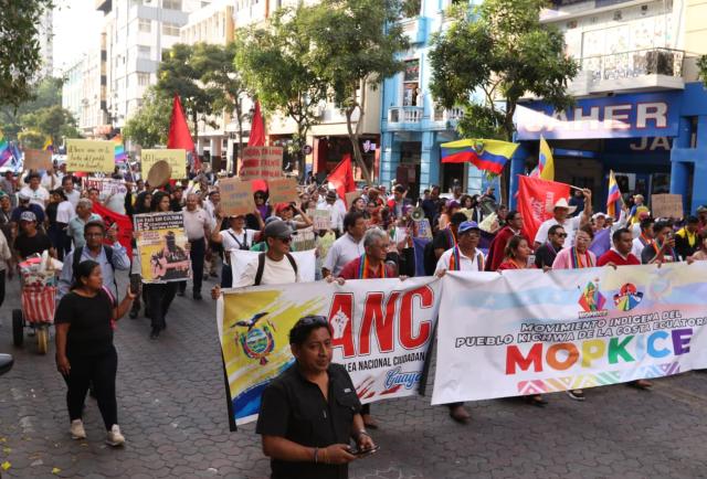 Los cientos de protestantes, entre los que había dirigentes de gremios de trabajadores, comunidades indígenas, montubias, adultos mayores y grupos GLBTI, recorrieron las calles levantado carteles y gritando mensajes de reclamos contra el presidente Noboa y las autoridades de seguridad de su gobierno.