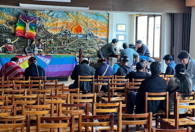 La cita tiene lugar en la Casa Indígena de la ciudad, donde desde tempranas horas llegaron delegaciones de distintas nacionalidades y pueblos del país. Aunque la Asamblea estaba prevista para las 09:00, al inicio de la mañana aún no arrancaba formalmente.