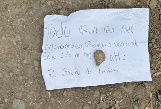 Junto a los cuerpos y una motocicleta Shineray, los agentes hallaron una nota escrita con marcador negro que decía: “Todo aquel que ande extorsionando, robando, vacunando será dado de baja. Att: El Grupo de Limpieza.”