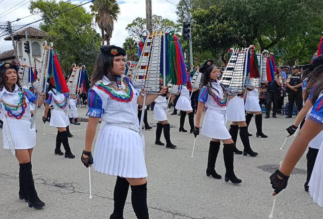 A las 09:00, las primeras bandas estudiantiles iniciaron el recorrido en el sector El Valle. Poco a poco avanzaron por la avenida Bustamante Celi, a la altura de Solca, marcando el ritmo con redoblantes y liras que resonaban entre los edificios húmedos por la llovizna. En total, participaron 35 establecimientos educativos, cada uno con su propio estilo, pero todos con la misma energía de quienes saben que la tradición se mantiene viva gracias a la gente.