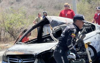 Las escenas posteriores fueron dramáticas. En videos que circularon en redes sociales se observa el cuerpo del motociclista, identificado como Luis Antonio Estrada Contreras, envuelto en llamas sobre la calzada, mientras a pocos metros el automóvil permanecía completamente incinerado con el conductor, Luis Benincasa, atrapado en su interior.