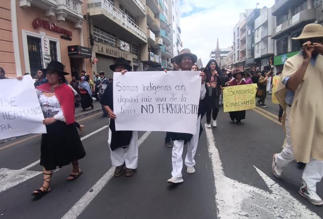 Desde Salasaka, Martha Chango pidió respeto a los pueblos: “No nos repriman ni nos maten. Señora gobernadora, vístase de pueblo y camine con nosotros. Queremos diálogo, no persecución”.