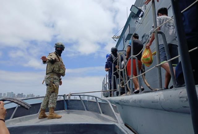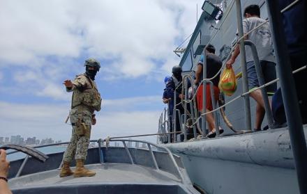 Siete de los pescadores fueron entregados a otra embarcación ecuatoriana, mientras que los diez restantes fueron trasladados a la lancha guardacostas y llevados a salvo al muelle de Salinas la tarde de este sábado 11 de octubre.