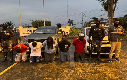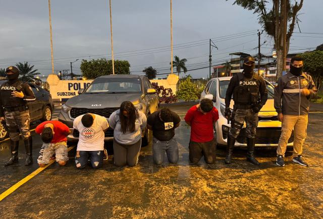 Los cinco aprehendidos fueron trasladados a un subcentro de salud para la revisión médica para luego ser llevados a Fiscalía. Los sospechosos fueron identificados como Marco Andrés Borja Díaz, Manuel Jesús Durazno Peralta, Jeremy Alexis Morales Moran, Paola Beatriz Pérez Zambrano y Kevin Gabriel Vélez Sánchez.