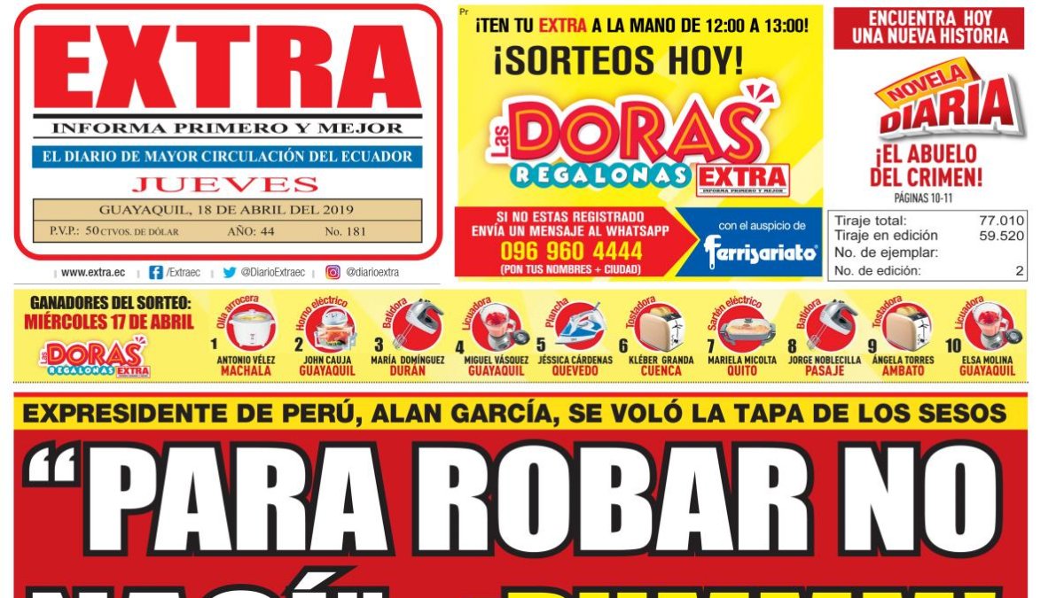 Ecuador Actualidad Edición impresa Facebook Twitter Whatsapp Whatsapp Copiar enlace Publicado por Redacción Extra Creado: 11.04.2019 | 06:03 Actualizado: 17.04.2019 | 18:39